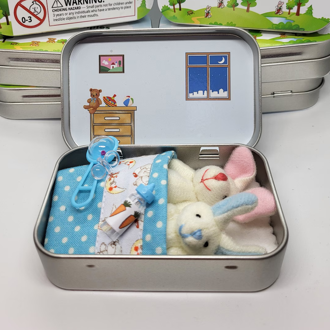 Inside the tin, your little bunny comes wrapped up snugly in a cozy pink blanket, along with a cute bottle and a lollipop for added playtime fun. It’s the perfect miniature companion for any child to care for. 🍼🍭